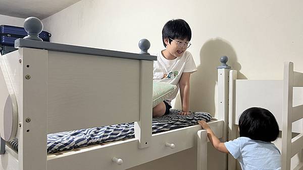 到貨後,就是無限的拆箱及組裝地獄了,如果是在對岸的話,大部分的傢俱都有包含安裝服務,真的非常輕鬆,但是到台灣之後就必須得要自己組裝,當然我們也有試著找網上有組裝服務的師傅,但是來了之後就說缺件沒辦法組裝,要收出趟的服務費,所以最後我們就氣得自己組裝,其他東西還好,但上下鋪真的是組裝地獄,強烈建議各位爸爸媽媽,工欲善其事必先利其器,要有好的組裝品質,要先把說明書跟工具準備好,並且要跟採購傢俱對口小編有順暢的溝通,我們順利的把上下鋪組裝好大概花了有一個多月的時間......但是看得喬碩諾三姊弟玩得那麼開心,這個心酸也就往肚子吞了!!