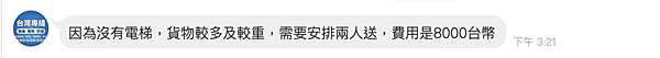 這個部分要提醒一下,因為喬碩諾爸家是公寓沒有電梯,所以上樓會需要再加收搬運的費用,這個部分就是當初沒有想到的,其實小編有提醒是送到一樓門口,所以家裡是這種狀況的朋友要特別注意一下喔!!