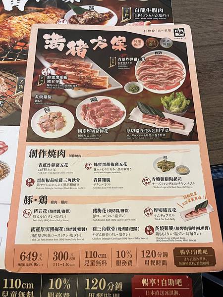 雞豬套餐吃到飽649元一個人,服務費另計,140公分以下300元